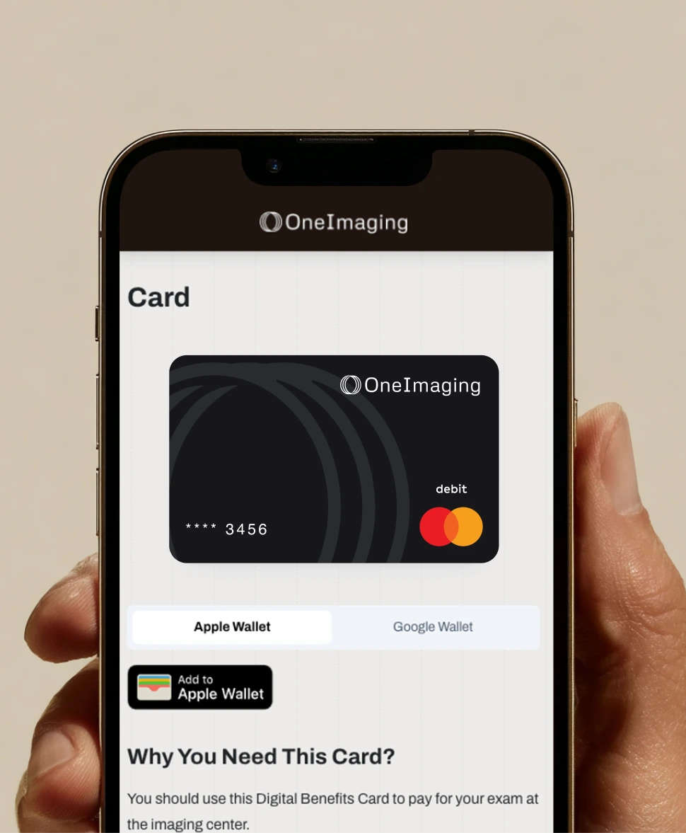 OneImaging then combines your cost share with the remaining balance and pays the imaging center the full cost of your exam using the Digital Payment Card.